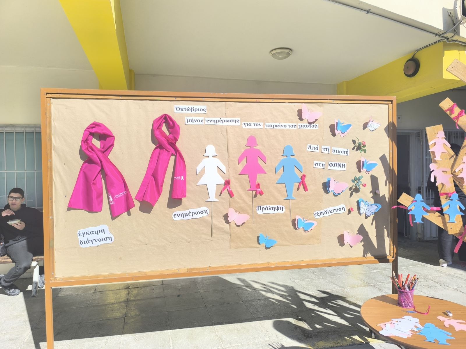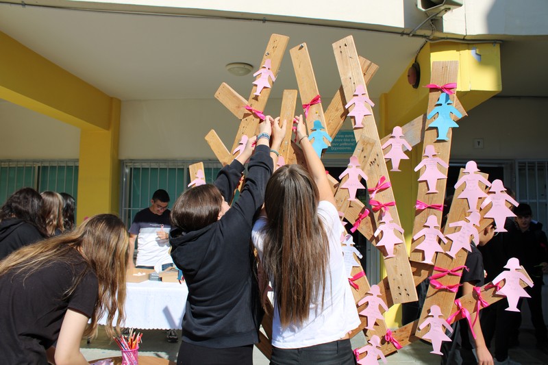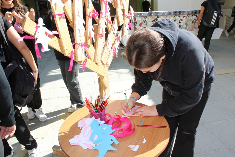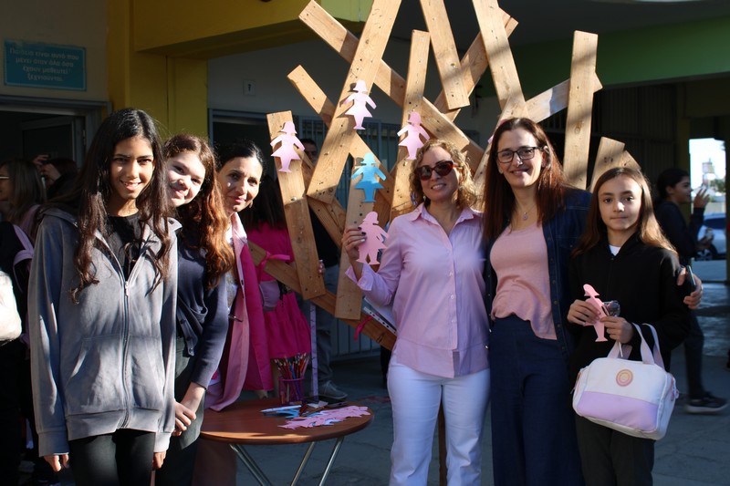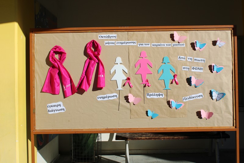 Με την αφορμή αυτή, πραγματοποιηθηκε από την Ομάδα Εθελοντισμού του Σχολείου μας, μικρή εκδήλωση στο Σχολείο μας την Παρασκευή, 16 Οκτωβρίου κατά τη διάρκεια των διαλειμμάτων, κατά την οποία οι μαθητές/τριες είχαν την ευκαιρία να γράψουν σε ροζ, γαλάζιες και άσπρες φιγούρες το δικό τους μήνυμα για τα άτομα που υποφέρουν από καρκίνο του μαστού και να τα τοποθετήσουν μαζί με μια ροζ κορδέλα σε πινακίδα. Επίσης, πωλήθηκαν σνακς, διακοσμημένα σε ροζ αποχρώσεις και προσφέρθηκε δωρεάν στους/στις μαθητές/τριες γάλα με τριαντάφυλλο. Όλα τα έσοδα θα δοθούν στον Σύνδεσμο Europa Donna.