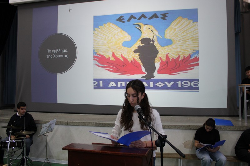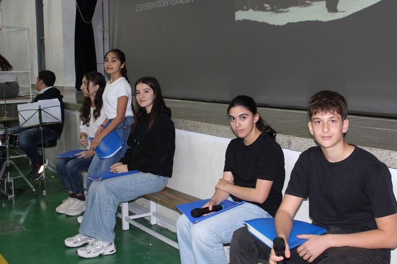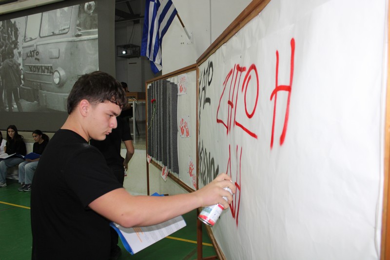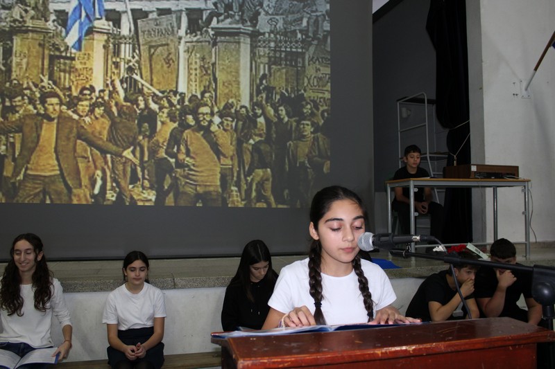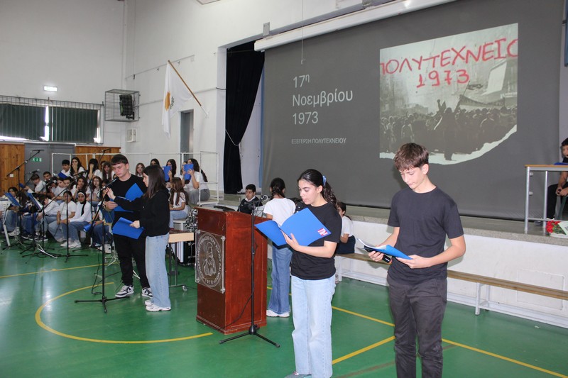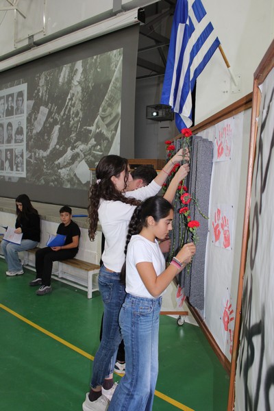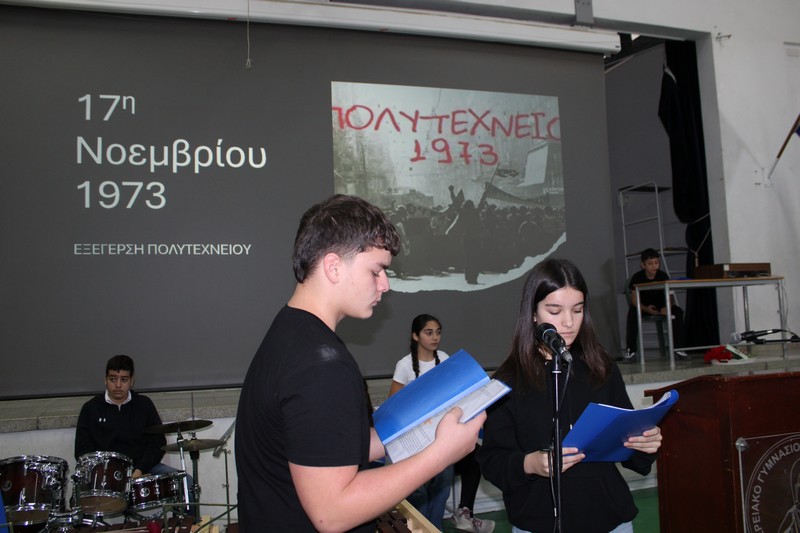 Την 17η Νοεμβρίου πραγματοποιήθηκε στο σχολείο μας εκδήλωση μνήμης και τιμής για την Επέτειο της Εξέγερσης του Πολυτεχνείου με τη συμμετοχή μαθητών και των τριών τάξεων. Το πρόγραμμα περιλάμβανε ποιήματα, τραγούδια καθώς και βιντεοπροβολή. Ακούστηκαν στίχοι από τα ποιήματα «Ένας ζεστός Νοέμβρης» και «Στον Διομήδη Κομνηνό», του Δημήτρη Ραβανή – Ρέντη, «1.050 Χιλιόκυκλοι», της Κωστούλας Μητροπούλου και «Στους σκοτωμένους σπουδαστές του Νοέμβρη», της Λένας Παππά. Η χορωδία του σχολείου τραγούδησε τα τραγούδια «Νοέμβρης ΄90», «Μη με ρωτάς» και «Τίποτα δεν πάει χαμένο». Κατά την εκδήλωση οι μαθητές φώναξαν συνθήματα υπερ της δημοκρατίας καταδικάζοντας τον φασισμό. Παράλληλα, κατέθεσαν κόκκινα γαρίφαλα προς τιμή των νεκρών της Εξέγερσης του Πολυτεχνείου. Η εκδήλωση έγινε σε κλίμα σεβασμού και συγκίνησης από όλους τους συμμετέχοντες και παρευρισκόμενους.
