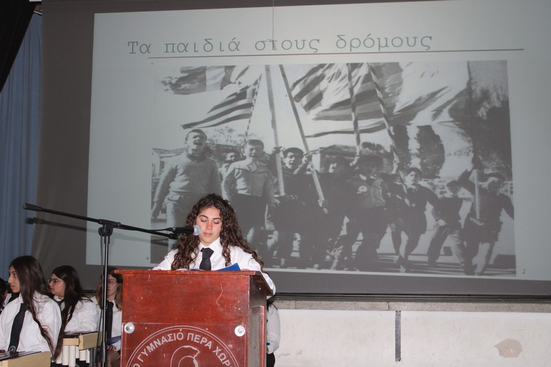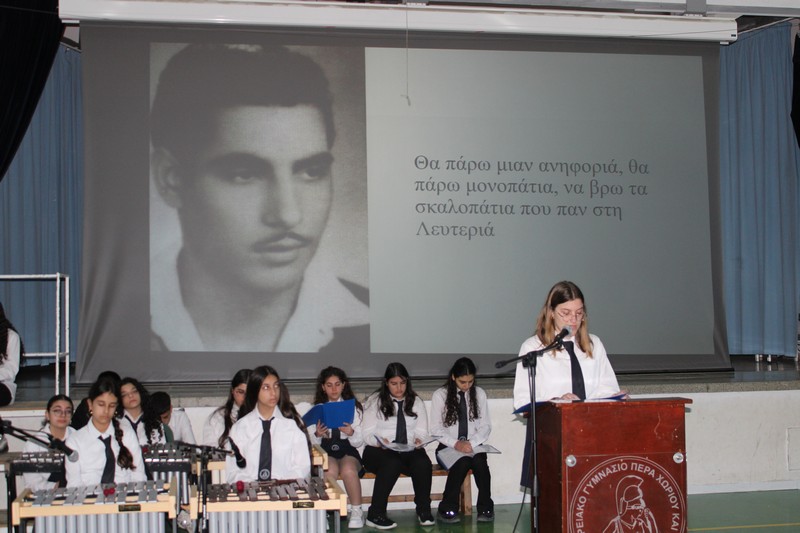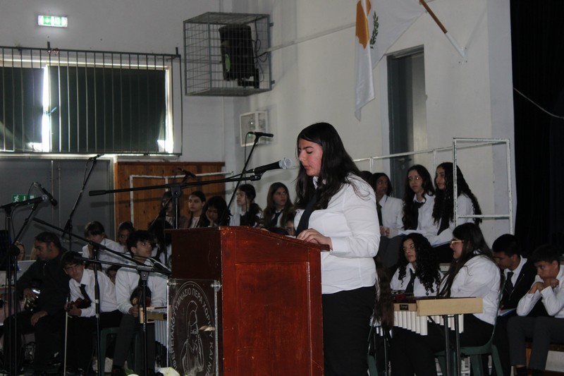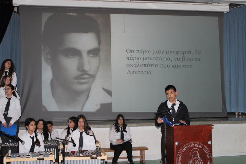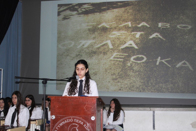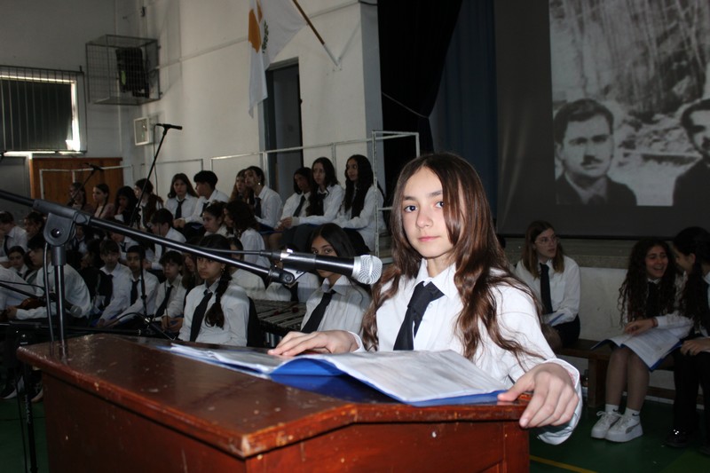 Στις 31 Μαρτίου τιμήσαμε στο Σχολείο μας την επέτειο της έναρξης του Απελευθερωτικού Αγώνα της Ε.Ο.Κ.Α. 1955-1959 με εκδήλωση, η οποία περιλάμβανε αφήγηση, απαγγελίες, θεατρικές σκηνές και τραγούδια.